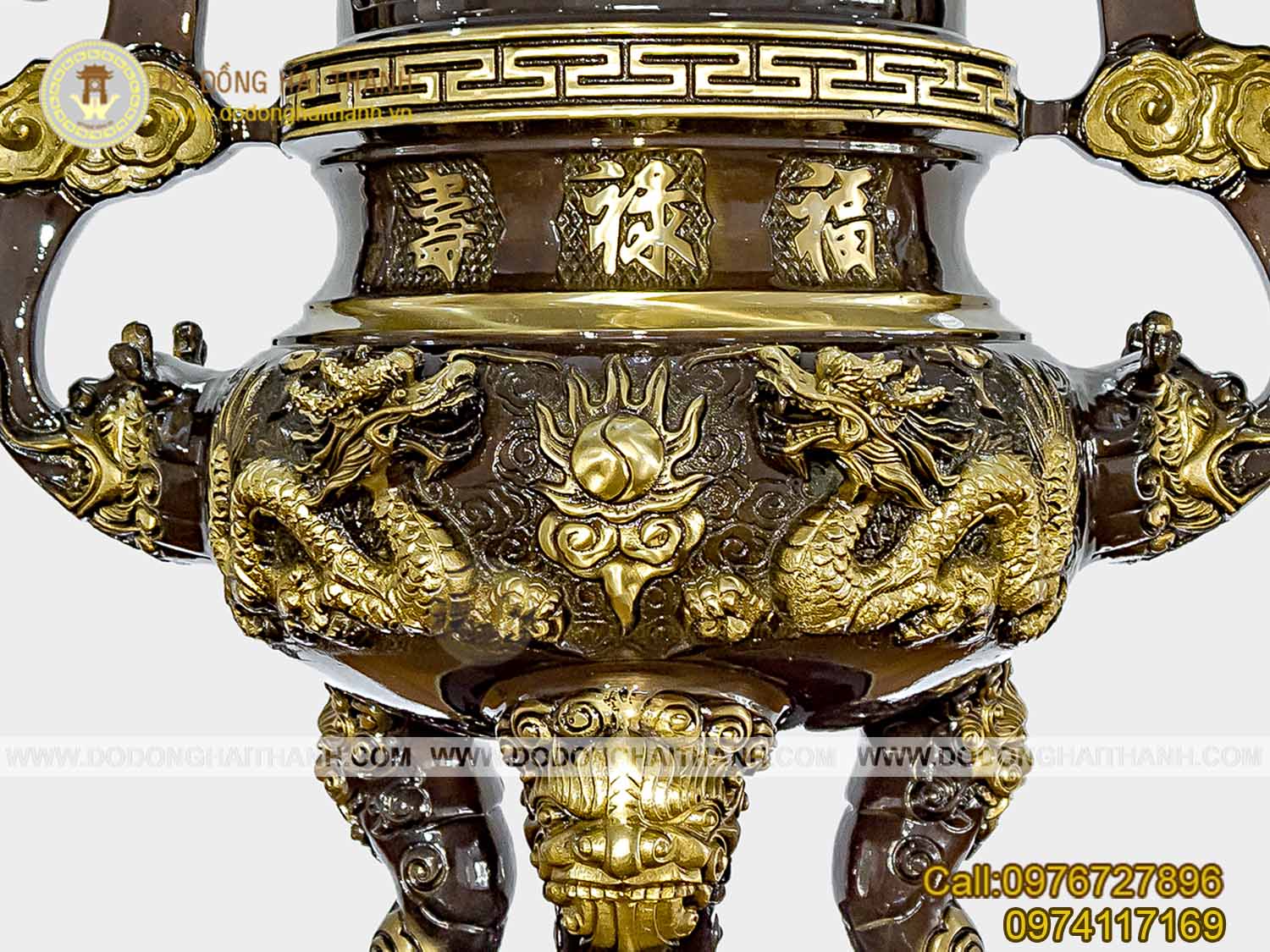 Bộ tam sự đồng vàng đúc nổi song long chầu nguyệt 3D