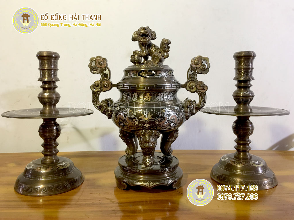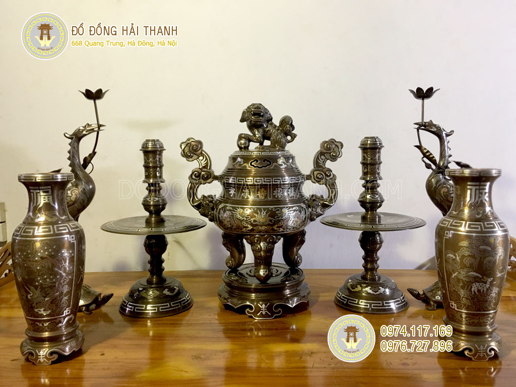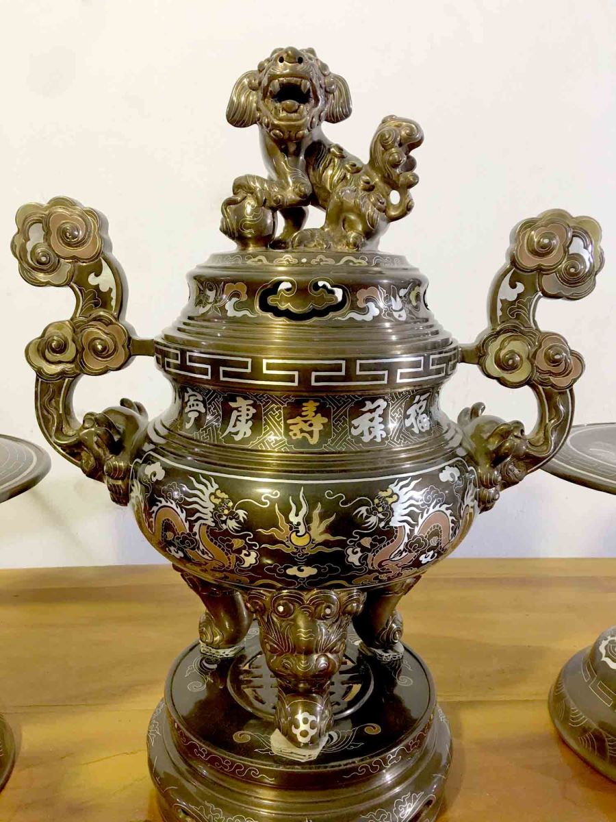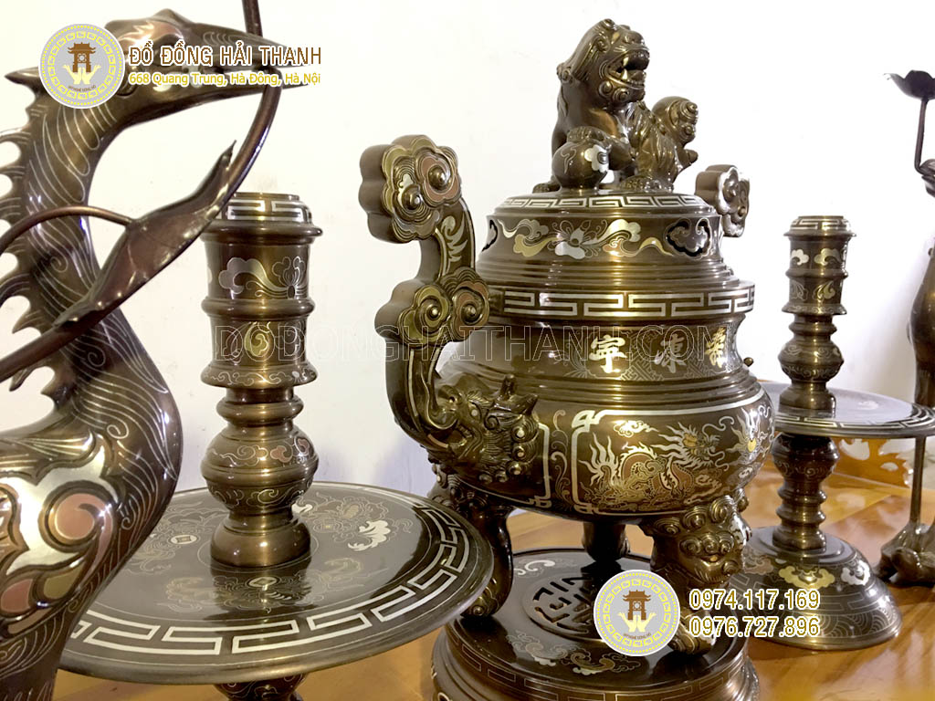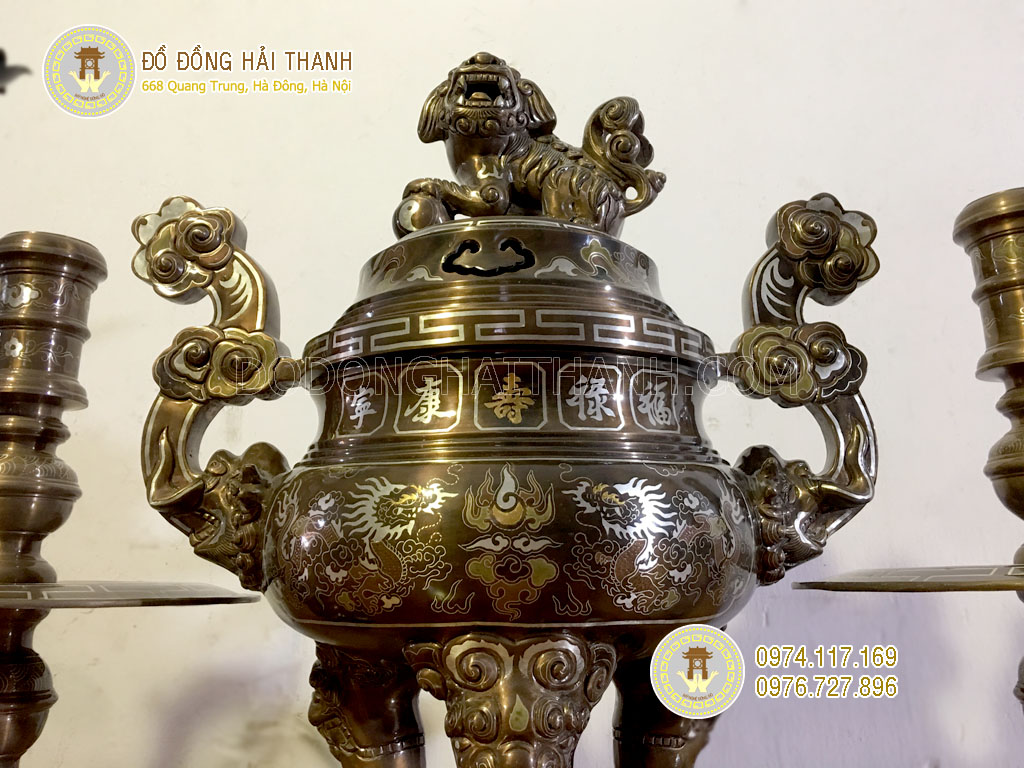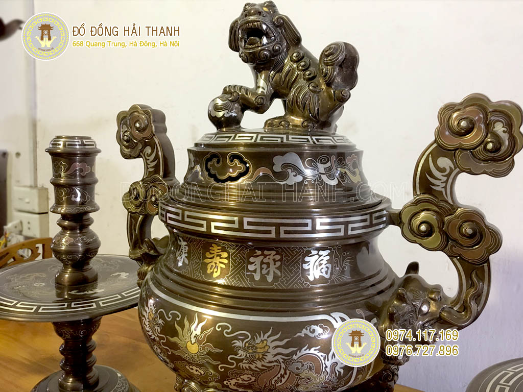 Chi tiết bộ đỉnh đồng thờ cúng khảm ngũ sắc cao cấp ngũ sự