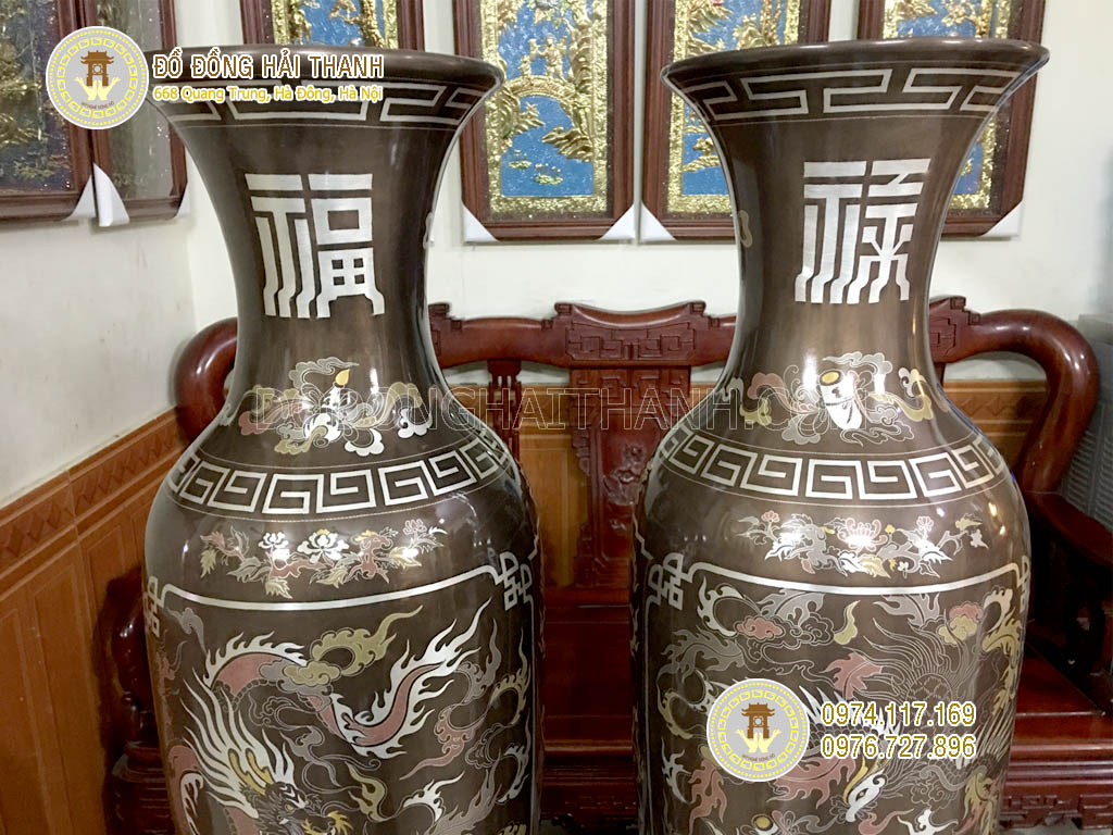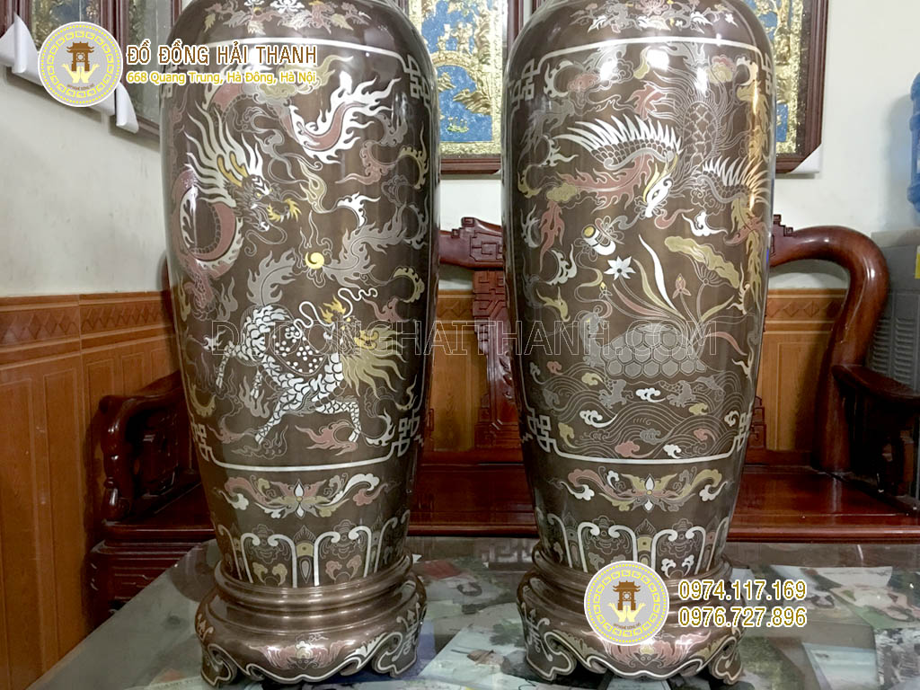 Đôi lộc bình tứ linh khảm ngũ sắc cao 81cm dùng trang trí phòng khách, phòng thờ, đền thờ, điện thờ... Chạm khảm ngũ sắc vàng, bạc, đồng đen, đồng xanh, đồng đỏ. Đôi lộc bình tứ linh khảm ngũ sắc dùng trang trí nội ngoại thất đẹp và sắc nét, tạo không gian trang trọng và lịch sự.