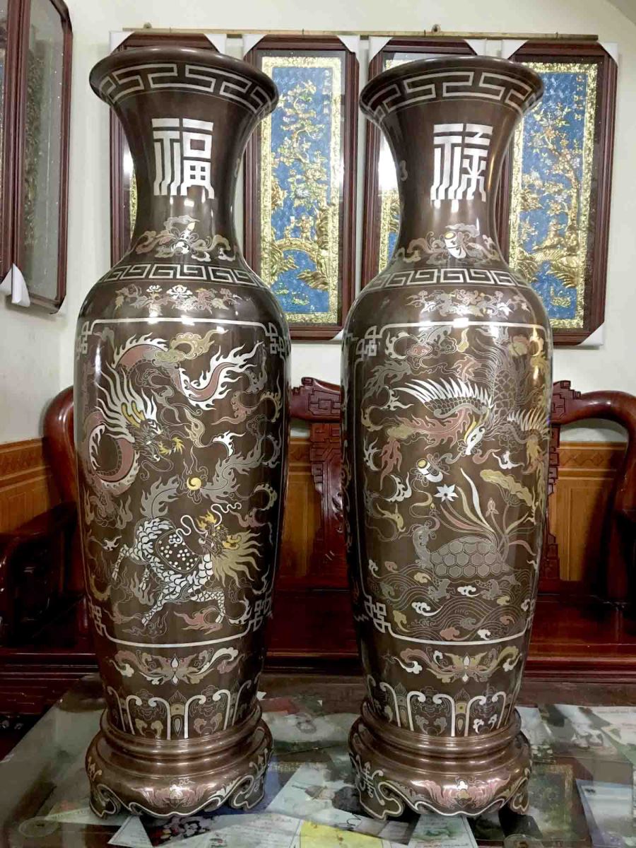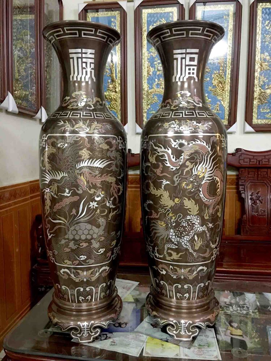 Đôi lộc bình tứ linh bằng đồng khảm ngũ sắc 81cm dùng trag trí nội thất, phòng khách gia đình, phòng thờ, đồ cúng tiến ý nghĩa.