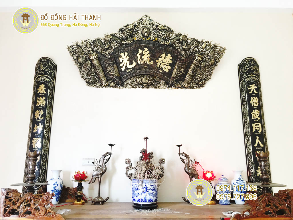 Bô hoành phi câu đối, cuốn thư câu đối bằng đồng vàng hun màu giả cổ kích thước 1 m55 phù hợp với ban thờ gia tiên 1m55 đi kèm bộ đỉnh đồng thờ cúng cao 60cm. Liên hệ Mỹ nghệ Đông Đô - Đồ đồng Hải Thanh 668 Quang Trung, Hà Đông, Hà Nội, đặt hàng hoành phi câu đối giá rẻ, chất lượng nhất thị trường Việt Nam.