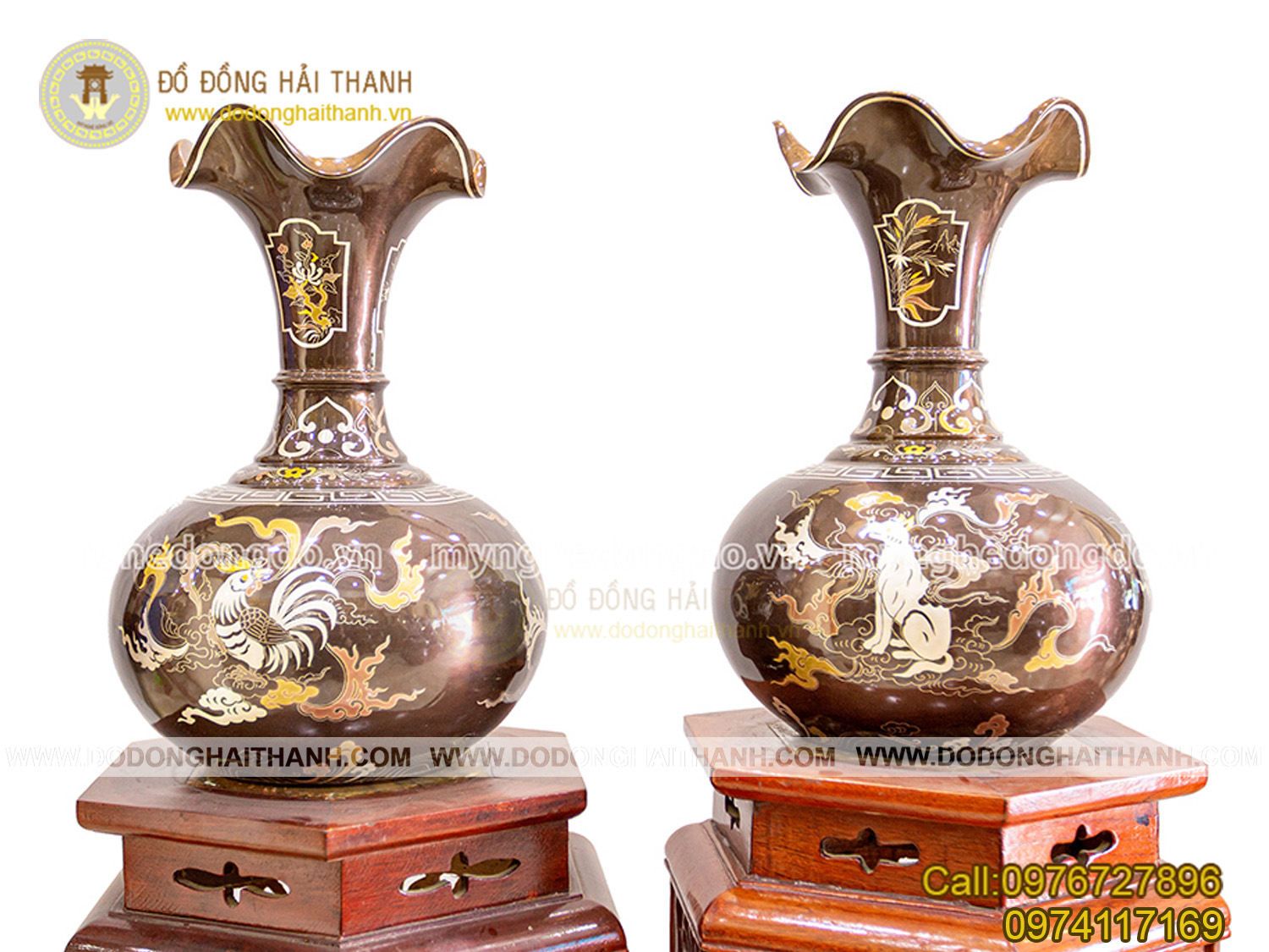 Chi tiết đôi lộc bình khảm ngũ sắc miệng loe cánh sen