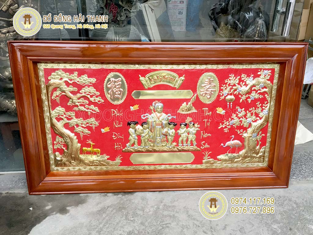 Bức tranh mừng thọ cụ bà toàn bộ họa tiết được làm bằng đồng vàng, khung gỗ với kích thước 81cmx146cm. Tranh mừng thọ này, ngoài ý nghĩa thiêng liêng là tỏ tấm lòng hiếu thảo của con cháu đối với ông bà còn có ý nhắc nhở cháu con giữ gìn truyền thống gia đình, kính trên nhường dưới, đoàn kết thương yêu , đùm bọc lẫn nhau khi may mắn cũng như hồi hoạn nạn để ông bà, cha mẹ chúng được vui lòng và hạnh phúc lúc tuổi già.