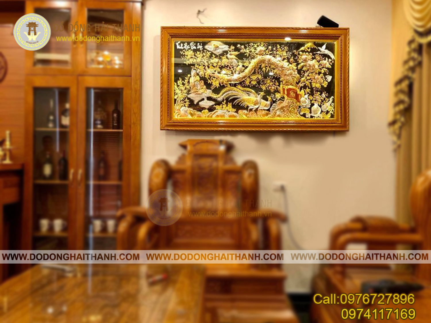 Đây là bức Tranh Đồng chạm Hoa cỏ, chim công, thể hiện sự bền vững, hạnh phúc… ..rất phong phú, sinh động thể hiện sự đầy đủ sung túc đúng với ý nghĩa bức tranh “Vinh Hoa Phú Quý”. Tranh được vẽ hết sức tỉ mỉ công phu sau đó được gò chạm trên đồng tấm cao cấp, từng đường nét của bức tranh được thể hiện sống động mãn nhãn dưới bàn tay người thợ.
